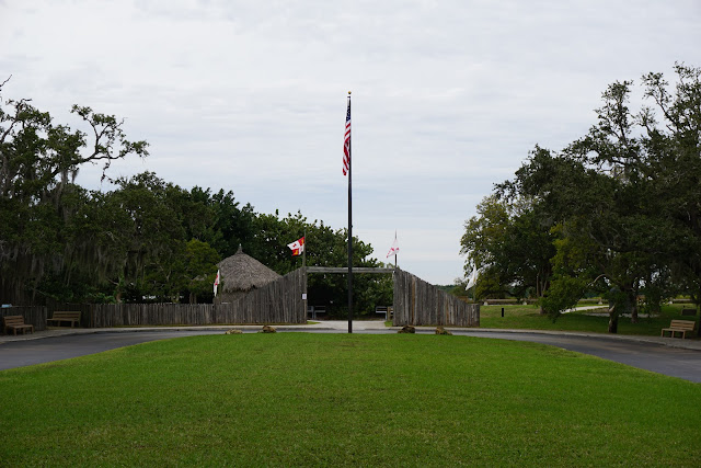 It was getting quite cold and blustery by the time I pulled in to De Soto. So nippy that the re-enactor in the mock village off to the left had called it quits early. Can’t blame him – I don’t think there were many people around, and even fewer that would have wanted to sit for any period of time! The hut just to the left of the entryway was a bit of fun. Not everyday you walk up to a thatch structure in Florida that speaks to you in German. Tried to get some footage, but the wind noise was just too overpowering.